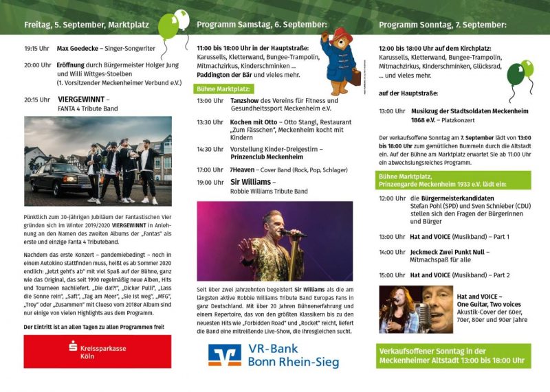 Den Auftakt macht Singer-Songwriter Max Goedecke mit gefühlvollen Songs und handgemachtem Sound. Anschließend wird das Altstadtfest offiziell durch Bürgermeister Holger Jung und Meckenheimer-Verbund-Vorsitzenden Willi Wittges-Stoelben eröffnet.